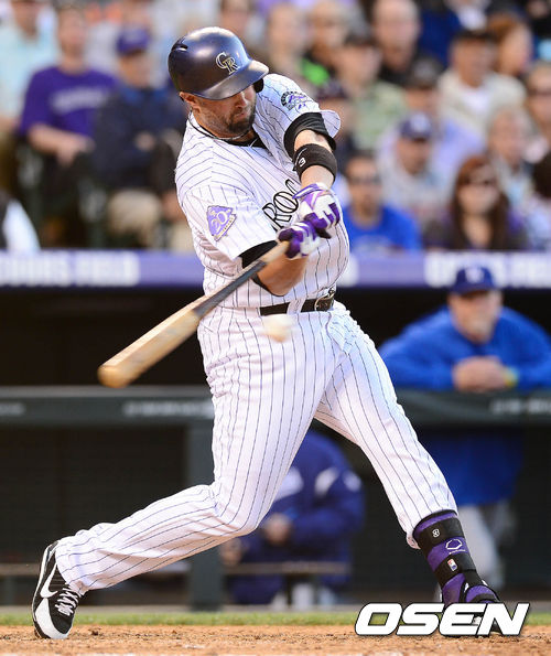 1일 오전(이하 한국시간) 미국 콜로라도주 덴버 쿠어스 필드에서 열린 콜로라도 로키스와 LA 다저스의 경기 4회말 1사 1,2루 커다이어가 1타점 적시타를 치고 있다.