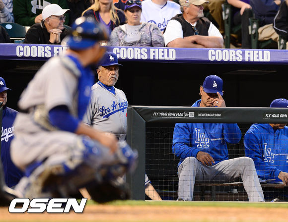 1일 오전(이하 한국시간) 미국 콜로라도주 덴버 쿠어스 필드에서 열린 콜로라도 로키스와 LA 다저스의 경기 5회말 매팅리 감독이 사인을 보내고 있다.