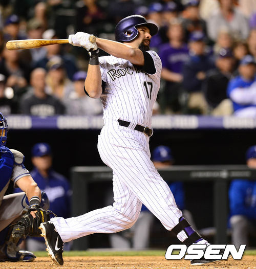 1일 오전(이하 한국시간) 미국 콜로라도주 덴버 쿠어스 필드에서 열린 콜로라도 로키스와 LA 다저스의 경기 9회초 1사 2루 헬튼이 투런포를 치고 있다.