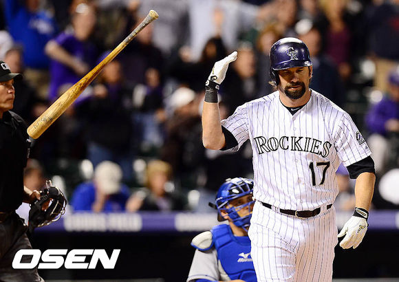 1일 오전(이하 한국시간) 미국 콜로라도주 덴버 쿠어스 필드에서 열린 콜로라도 로키스와 LA 다저스의 경기 9회초 1사 2루 헬튼이 투런포를 치고 1루로 향하고 있다.