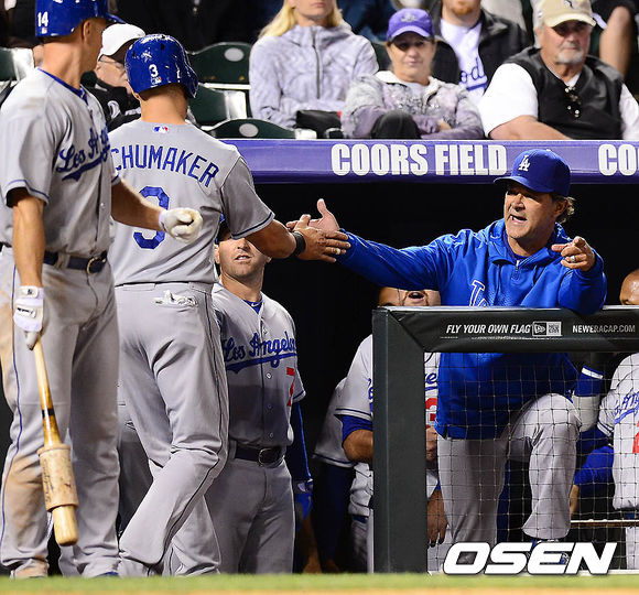 1일 오전(이하 한국시간) 미국 콜로라도주 덴버 쿠어스 필드에서 열린 콜로라도 로키스와 LA 다저스의 경기 10회초 2사 2루 우리베의 1타점 적시타에 득점에 성공한 2루주자 슈마커가 덕아웃에서 매팅리 감독과 하이파이브를 하고 있다.