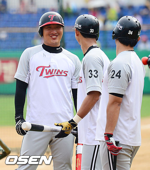 1일 오후 광주 무등구장에서 2013 한국야쿠르트 세븐프로야구 KIA 타이거즈와 LG 트윈스의 경기가 열릴 예정인 가운데 양팀 훈련 시간에 LG 이진영이 어제 경기에서 만루 홈런을 날린 박용택과 즐겁게 얘기를 나누고 있다.