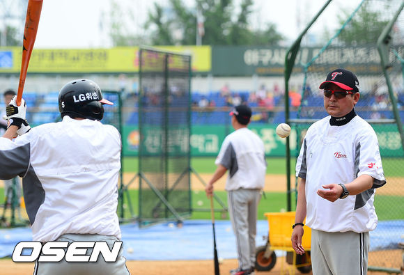 1일 오후 광주 무등구장에서 2013 한국야쿠르트 세븐프로야구 KIA 타이거즈와 LG 트윈스의 경기가 열릴 예정인 가운데 양팀 훈련 시간에 LG 김기태 감독이 권용관에게 배팅볼을 던져주고 있다.