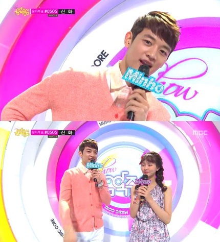이날 민호는 1위 후보인 그룹 신화의 무대를 본 이후 자신에게로 넘어온 카메라를 향해 MC 멘트를 진행했다.