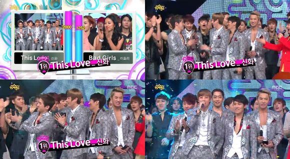 신화는 1일 오후 방송된 MBC ‘쇼! 음악중심(이하 ’음중‘)’에서 2PM, 포미닛, 이효리를 꺾고 타이틀곡 ‘디스 러브(This Love)'로 1위를 차지했다.
