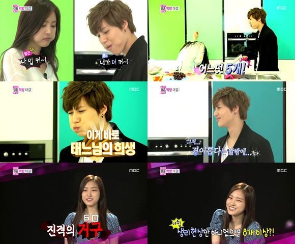 이날 방송에서 과일을 먹던 두 사람은 태민의 제안으로 먹방대결을 펼쳤다. 누가 더 입에 토마토를 많이 넣는지에 대한 대결.