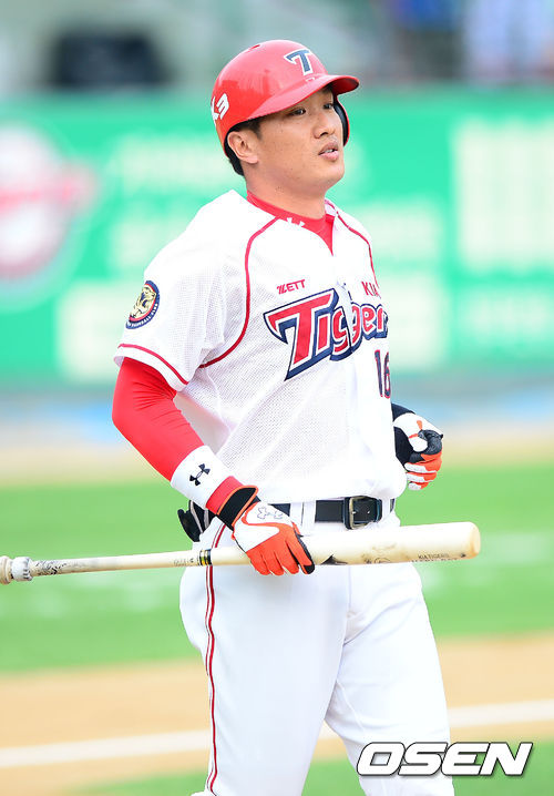 1일 오후 광주 무등구장에서 열린 2013 한국야쿠르트 세븐프로야구 KIA 타이거즈와 LG 트윈스의 경기, 1회말 1사 주자 없는 상황에서 타석에 오른 김주찬이 1루수 파울 플라이 아웃 당하며 아쉬워하고 있다.