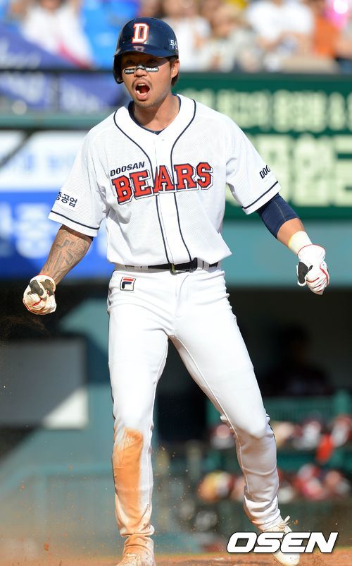 홈스틸 성공 후 환호하는 오재원