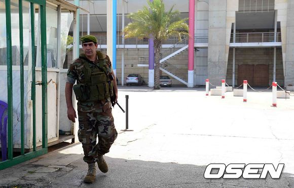 1일 오후(한국시간) 한국과 레바논의 2014 브라질 월드컵 아시아 최종 예선전을 앞둔 레바논 베이루트 카밀 샤문 스포츠시티 스타디움. 경기장 앞 경비를 하고 있는 군인이 취재진을 바라보고 있다.
