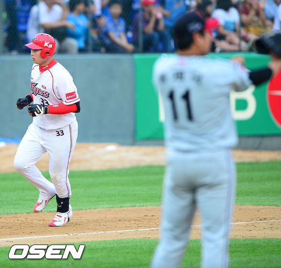1일 오후 광주 무등구장에서 열린 2013 한국야쿠르트 세븐프로야구 KIA 타이거즈와 LG 트윈스의 경기, 5회말 1사 주자 없는 상황에서 KIA 김주형이 좌월 솔로 홈런을 날린 후 그라운드를 돌고 있다.