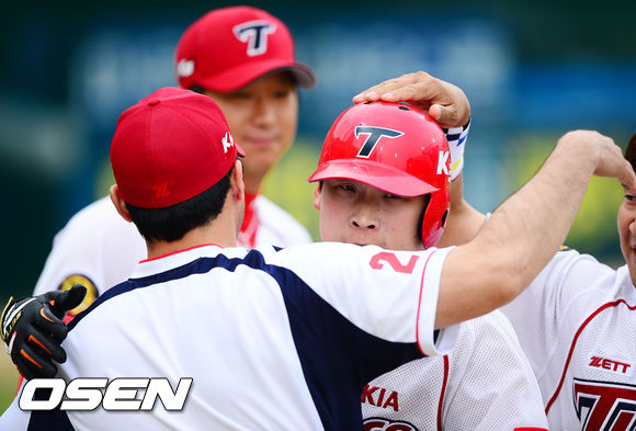 1일 오후 광주 무등구장에서 열린 2013 한국야쿠르트 세븐프로야구 KIA 타이거즈와 LG 트윈스의 경기, 5회말 1사 주자 없는 상황에서 KIA 김주형이 좌월 솔로 홈런을 날린 후 덕아웃에서 서재응과 포옹을 하고 있다.