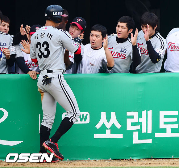 1일 오후 광주 무등구장에서 열린 2013 한국야쿠르트 세븐프로야구 KIA 타이거즈와 LG 트윈스의 경기, 4회초 무사 주자 2루 LG 정의윤의 중견수 앞 1타점 적시타때 홈을 밟은 박용택이 덕아웃에서 동료들과 하이파이브를 하고 있다.