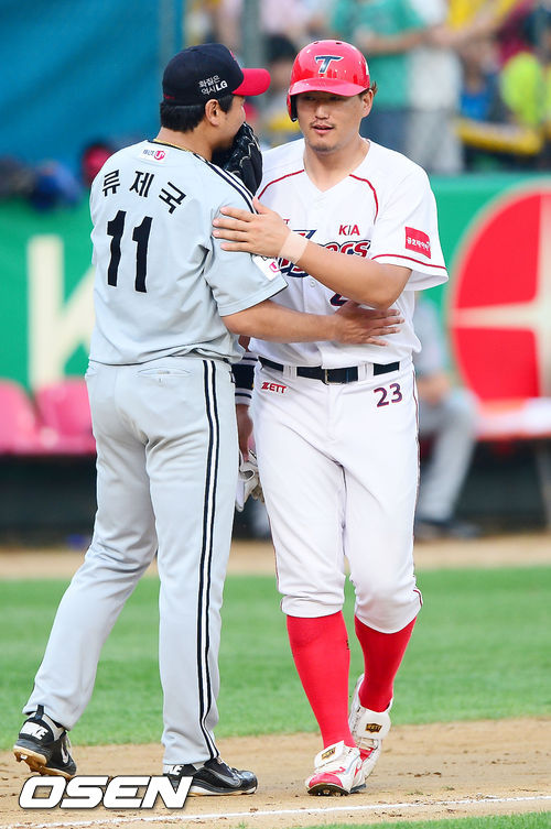 1일 오후 광주 무등구장에서 열린 2013 한국야쿠르트 세븐프로야구 KIA 타이거즈와 LG 트윈스의 경기, 6회말을 마치고 LG 류제국이 최희섭에게 찾아가 6회말 2사 주자 2루 LG 류제국이 KIA 최희섭에게 실수로 공을 맞힌 것에 대해 사과하고 있다.