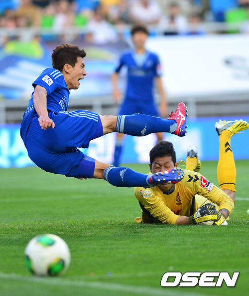 1일 오후 수원월드컵경기장에서 '2013 현대오일뱅크 K리그 클래식' 수원 삼성과 경남FC의 경기가 열렸다. 후반 수원 오장은이 경남 골키퍼 박청효의 선방에 걸리며 넘어지고 있다.