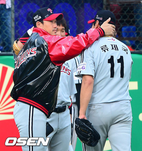 1일 오후 광주 무등구장에서 열린 2013 한국야쿠르트 세븐프로야구 KIA 타이거즈와 LG 트윈스의 경기, 6회말을 마치고 LG 류제국과 봉중근이 기쁨을 나누고 있다.