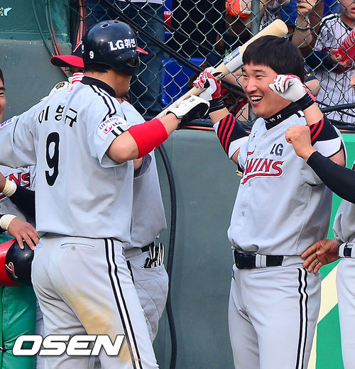 1일 오후 광주 무등구장에서 열린 2013 한국야쿠르트 세븐프로야구 KIA 타이거즈와 LG 트윈스의 경기, 7회초 1사 주자 3루 LG 김용의의 1타점 3루타때 홈을 밟은 이병규가 덕아웃에서 이진영과 기쁨을 나누고 있다.