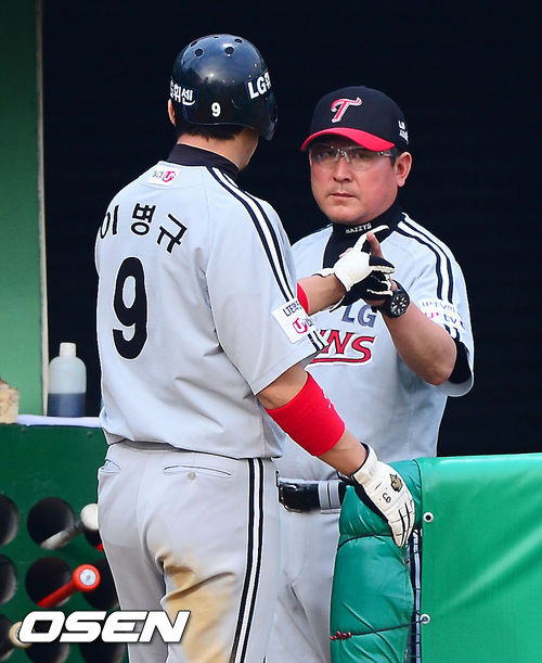 1일 오후 광주 무등구장에서 열린 2013 한국야쿠르트 세븐프로야구 KIA 타이거즈와 LG 트윈스의 경기, 7회초 1사 주자 3루 LG 김용의의 1타점 3루타때 홈을 밟은 이병규가 김기태 감독과 하이파이브를 하고 있다.