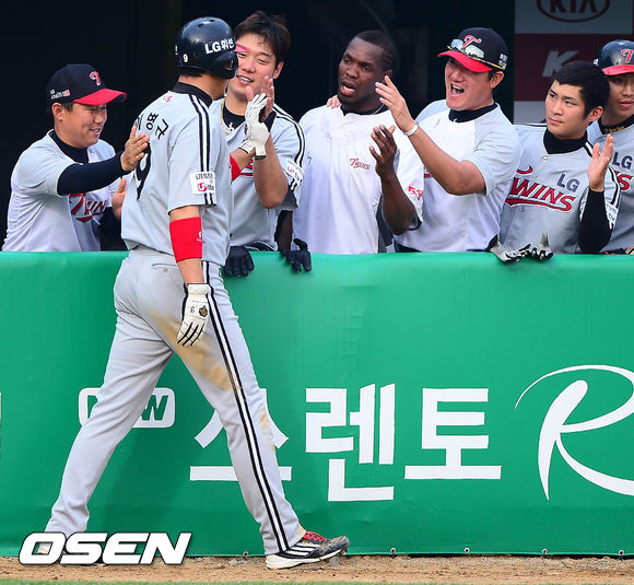1일 오후 광주 무등구장에서 열린 2013 한국야쿠르트 세븐프로야구 KIA 타이거즈와 LG 트윈스의 경기, 7회초 1사 주자 3루 LG 김용의의 1타점 3루타때 홈을 밟은 이병규가 덕아웃에서 동료들과 하이파이브를 하고 있다.