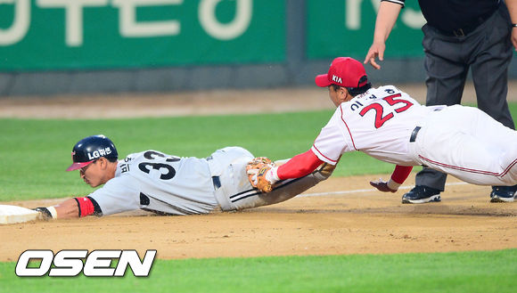 1일 오후 광주 무등구장에서 열린 2013 한국야쿠르트 세븐프로야구 KIA 타이거즈와 LG 트윈스의 경기, 8회초 무사 주자 1,2루 LG 이병규 타석에서 LG 주자들이 이중 도루를 시도, LG 박용택이 3루에서 KIA 3루주자 이범호에게 태그아웃 당하고 있다.