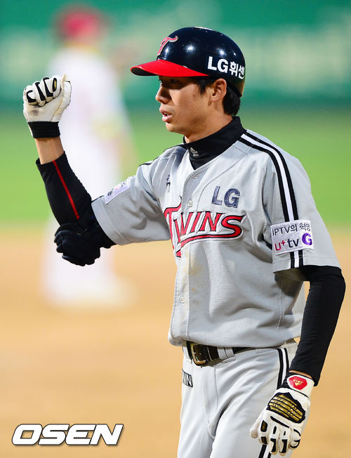 1일 오후 광주 무등구장에서 열린 2013 한국야쿠르트 세븐프로야구 KIA 타이거즈와 LG 트윈스의 경기, 8회초 2사 주자 1,2루 LG 김용의가 역전 1타점 적시타를 날린 후 기뻐하고 있다.