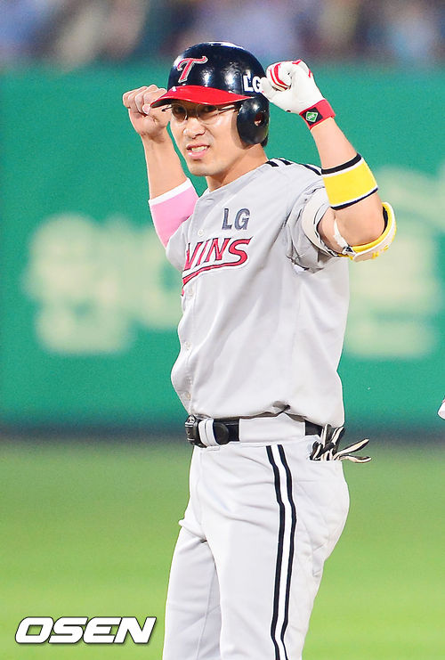 1일 오후 광주 무등구장에서 열린 2013 한국야쿠르트 세븐프로야구 KIA 타이거즈와 LG 트윈스의 경기, 8회초 2사 주자 만루 LG 정성훈이 우익수 오른쪽 2타점 적시타를 날린 후 2루에서 기뻐하고 있다.
