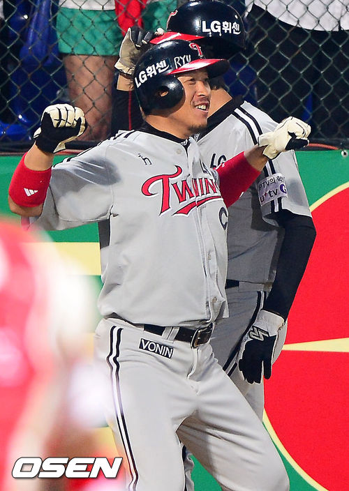 1일 오후 광주 무등구장에서 열린 2013 한국야쿠르트 세븐프로야구 KIA 타이거즈와 LG 트윈스의 경기, 8회초 2사 주자 만루 LG 정성훈의 우익수 오른쪽 2타점 적시타때 홈을 밟은 이병규가 덕아웃에서 세레모니를 하고 있다.