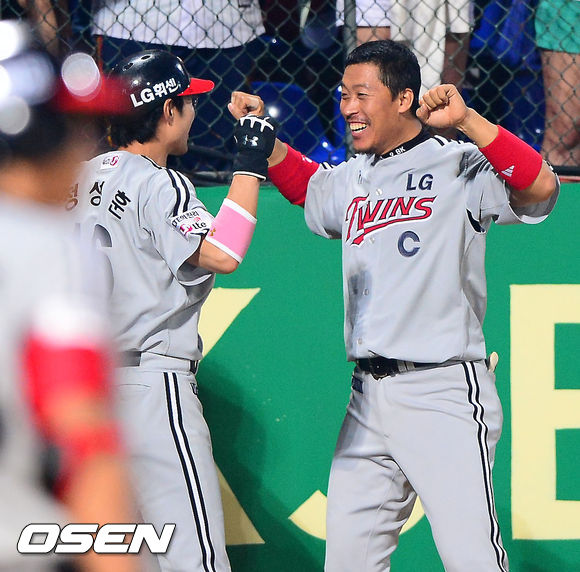 1일 오후 광주 무등구장에서 열린 2013 한국야쿠르트 세븐프로야구 KIA 타이거즈와 LG 트윈스의 경기, 8회초 2사 주자 2,3루 LG 오지환의 좌중간 2타점 적시타때 홈을 밟은 정성훈이 덕아웃에서 이병규와 세레모니를 하고 있다.