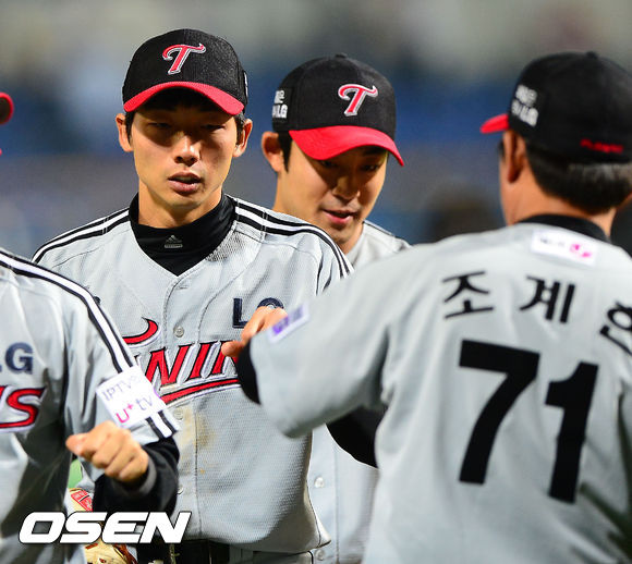 경기를 마치고 LG 김용의가 코치진들과 하이파이브를 하고 있다./ rumi@osen.co.kr
