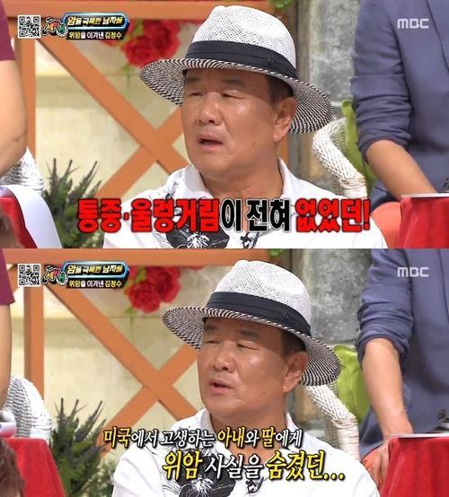 또한 김정수는 "혈변을 봤다고 하니 응급실로 가서 열흘간 검사를 했다. 수술을 할 수 없을 정도로 위암이 진행된 상태였다"면서 "어떤 여의사분이 수술을 지원하셔서 살아났다"고 말했다.