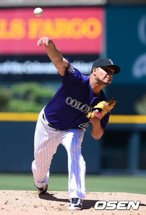 2일 새벽(이하 한국시간) 미국 콜로라도주 덴버 쿠어스 필드에서 열린 콜로라도 로키스와 LA 다저스의 경기 로키스 선발 샤신이 역투하고 있다.