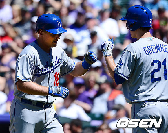 2일 새벽(이하 한국시간) 미국 콜로라도주 덴버 쿠어스 필드에서 열린 콜로라도 로키스와 LA 다저스의 경기 3회초 선두타자 페데로위츠가 솔로포를 친 후 그레인키와 하이파이브를 하고 있다.