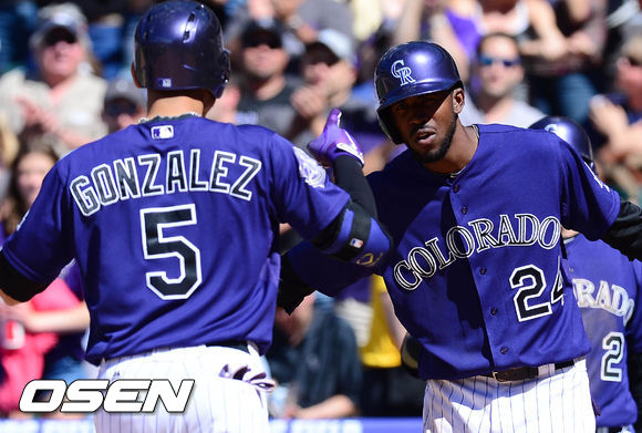 2일 새벽(이하 한국시간) 미국 콜로라도주 덴버 쿠어스 필드에서 열린 콜로라도 로키스와 LA 다저스의 경기 5회말 2사 3루 곤살레스가 투런포를 친 후 홈에서 파울러와 하이파이브를 하고 있다.