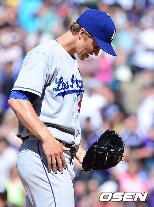 2일 새벽(이하 한국시간) 미국 콜로라도주 덴버 쿠어스 필드에서 열린 콜로라도 로키스와 LA 다저스의 경기 5회말 2사 3루 그레인키가 곤살레스에게 투런포를 내준 후 고개를 떨구고 있다.