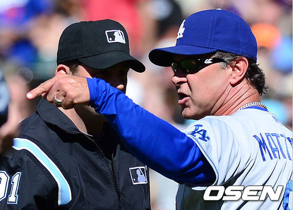 2일 새벽(이하 한국시간) 미국 콜로라도주 덴버 쿠어스 필드에서 열린 콜로라도 로키스와 LA 다저스의 경기 6회말 무사 1루 토릴바의 투수 앞 땅볼 상황, 1루주자 아레나도가 2루에서 세이프되자 매팅리 감독이 직선타 가 아니냐며 항의하고 있다.