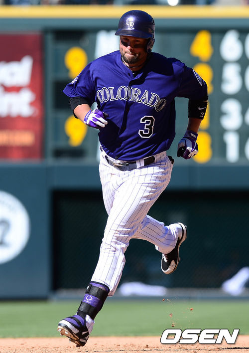 2일 새벽(이하 한국시간) 미국 콜로라도주 덴버 쿠어스 필드에서 열린 콜로라도 로키스와 LA 다저스의 경기 7회말 1사 1루 커다이어가 투런포를 친 후 베이스를 돌고 있다.