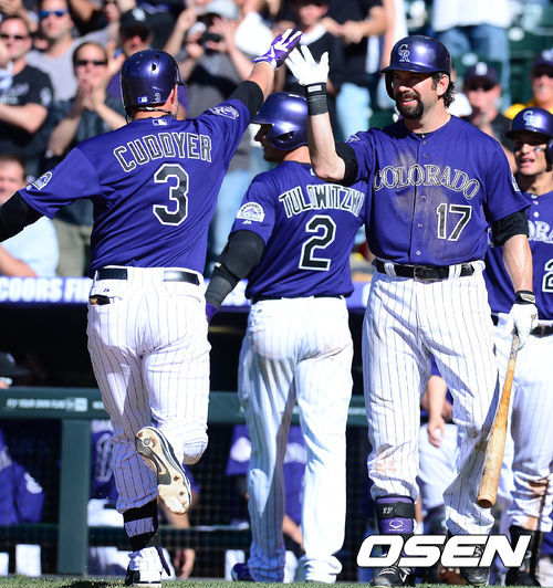 2일 새벽(이하 한국시간) 미국 콜로라도주 덴버 쿠어스 필드에서 열린 콜로라도 로키스와 LA 다저스의 경기 7회말 1사 1루 커다이어가 투런포를 친 후 덕아웃으로 향하며 헬튼과 하이파이브를 하고 있다.