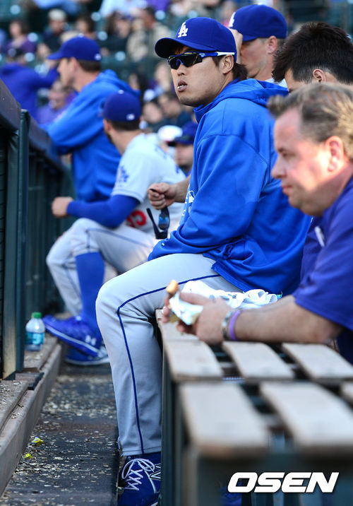 2일 새벽(이하 한국시간) 미국 콜로라도주 덴버 쿠어스 필드에서 열린 콜로라도 로키스와 LA 다저스의 경기 10회 공수교대 때 류현진이 덕아웃에 앉아 있다.