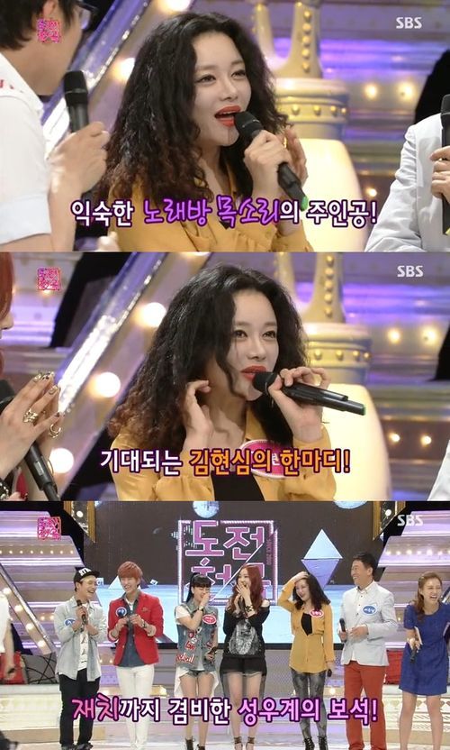 2일 방송된 SBS ‘도전 천곡’에서 MC 장윤정이 “김현심이 노래방 기계 목소리를 했더라. 한 번만 해달라”라고 말했다.