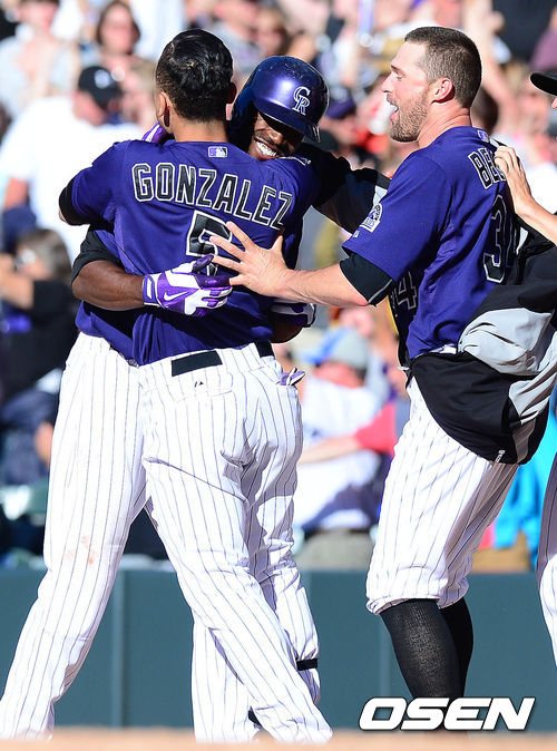 2일 새벽(이하 한국시간) 미국 콜로라도주 덴버 쿠어스 필드에서 열린 콜로라도 로키스와 LA 다저스의 경기 10회말 2사 1,2루 파울러가 끝내기 안타를 친 후 동료들과 기쁨을 나누고 있다.
