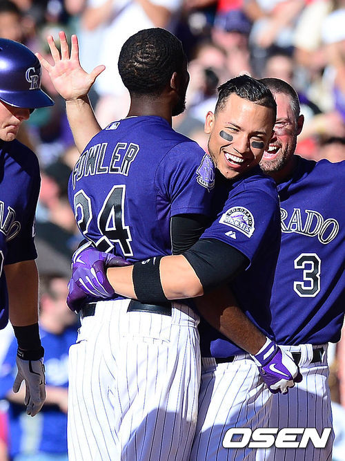 2일 새벽(이하 한국시간) 미국 콜로라도주 덴버 쿠어스 필드에서 열린 콜로라도 로키스와 LA 다저스의 경기 10회말 2사 1,2루 파울러가 끝내기 안타를 친 후 동료들과 기쁨을 나누고 있다.