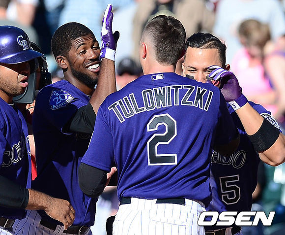 2일 새벽(이하 한국시간) 미국 콜로라도주 덴버 쿠어스 필드에서 열린 콜로라도 로키스와 LA 다저스의 경기 10회말 2사 1,2루 파울러가 끝내기 안타를 친 후 동료들과 기쁨을 나누고 있다.