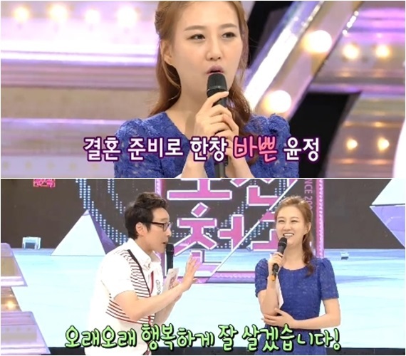 2일 오전 방송된 SBS '도전 천곡'에서는 MC 이휘재가 장윤정에게 "이제 아줌마가 되는 게 얼마 남지 않았다"라고 말했다. 이와 동시에 화면에는 '경축 D-26'이란 자막이 떴다.