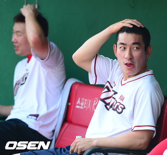 2일 오후 광주 무등구장에서 2013 한국야쿠르트 세븐프로야구 KIA 타이거즈와 LG 트윈스의 경기가 열릴 예정인 가운데 양 팀 훈련시간에 홍재호 안치홍이 머리카락을 짧게 자른 머리를 보여주며 쑥스러워하고 있다.