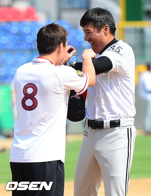 2일 오후 광주 무등구장에서 2013 한국야쿠르트 세븐프로야구 KIA 타이거즈와 LG 트윈스의 경기가 열릴 예정인 가운데 양 팀 훈련시간에 KIA 안치홍이 LG 최태원 코치에게 장난을 치고 있다.