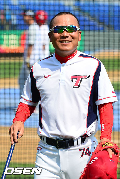 2일 오후 광주 무등구장에서 2013 한국야쿠르트 세븐프로야구 KIA 타이거즈와 LG 트윈스의 경기가 열릴 예정인 가운데 양 팀 훈련시간에 KIA 김평호 코치가 취재진을 향해 미소짓고 있다.