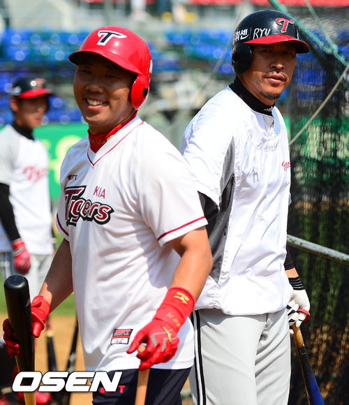 2일 오후 광주 무등구장에서 2013 한국야쿠르트 세븐프로야구 KIA 타이거즈와 LG 트윈스의 경기가 열릴 예정인 가운데 양 팀 훈련시간에 LG 이병규가 KIA 이범호의 엉덩이를 치고 있다.