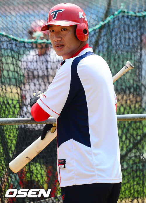 2일 오후 광주 무등구장에서 2013 한국야쿠르트 세븐프로야구 KIA 타이거즈와 LG 트윈스의 경기가 열릴 예정인 가운데 양 팀 훈련시간에 KIA 김주찬이 LG 덕아웃 쪽을 바라보며 타격연습을 기다리고 있다.
