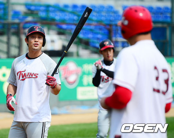 2일 오후 광주 무등구장에서 2013 한국야쿠르트 세븐프로야구 KIA 타이거즈와 LG 트윈스의 경기가 열릴 예정인 가운데 양 팀 훈련시간에 LG 정의윤과 KIA 김주형이 타격훈련을 기다리며 즐겁게 얘기를 나누고 있다.