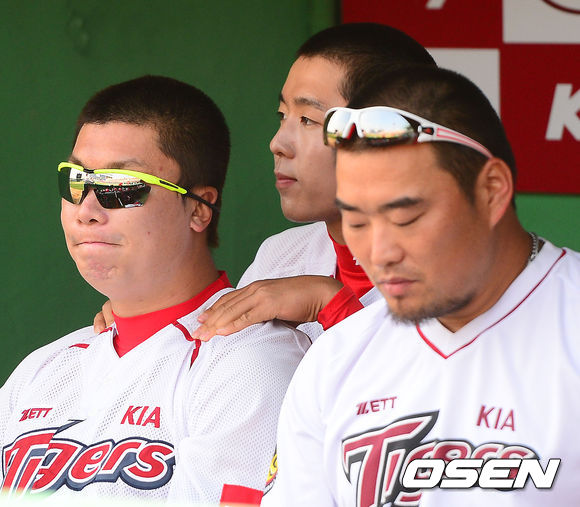 2일 오후 광주 무등구장에서 2013 한국야쿠르트 세븐프로야구 KIA 타이거즈와 LG 트윈스의 경기가 열릴 예정인 가운데 양 팀 훈련시간에 KIA 나지완 윤완주 김진우가 삭발한 모습으로 준비를 하고 있다.