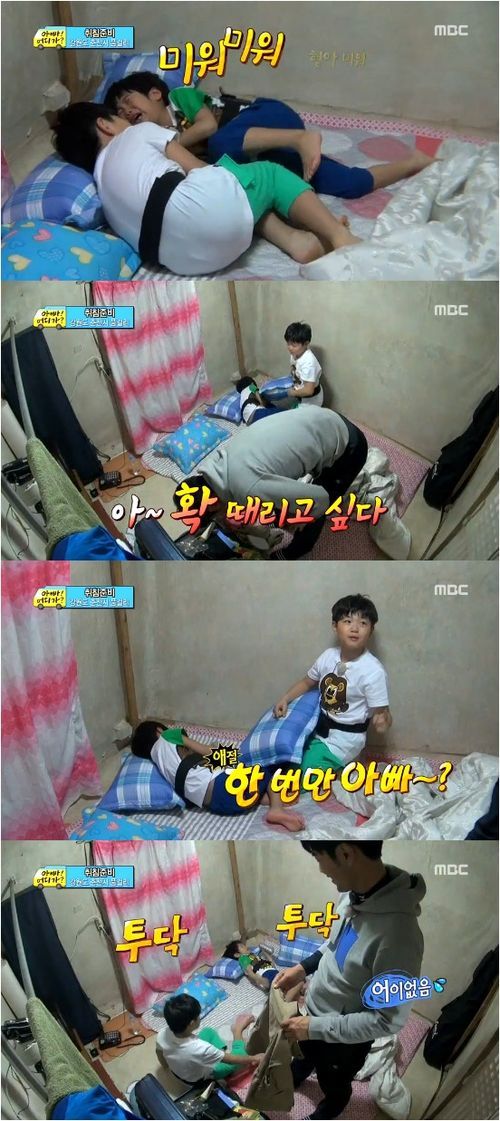 이탁수와 이준수는 2일 방송된 MBC 예능프로그램 ‘일밤-아빠 어디가’에서 잠자리에 앞서 자리 다툼을 했다. 이준수가 좁은 방에서 자리를 차지하고 버티고 있었고 형 이탁수는 “옆으로 가달라”고 부탁을 했다.